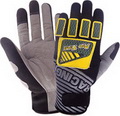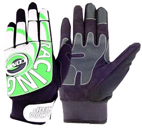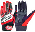 Motocross Glove Made of Palm: Grey amara silicon finger printed. Back : Red & grey foreway (nylon cloth) neoprene finger + rubber protection patches + reflector piping + neoprene wrist cuff & velcro closing strap.